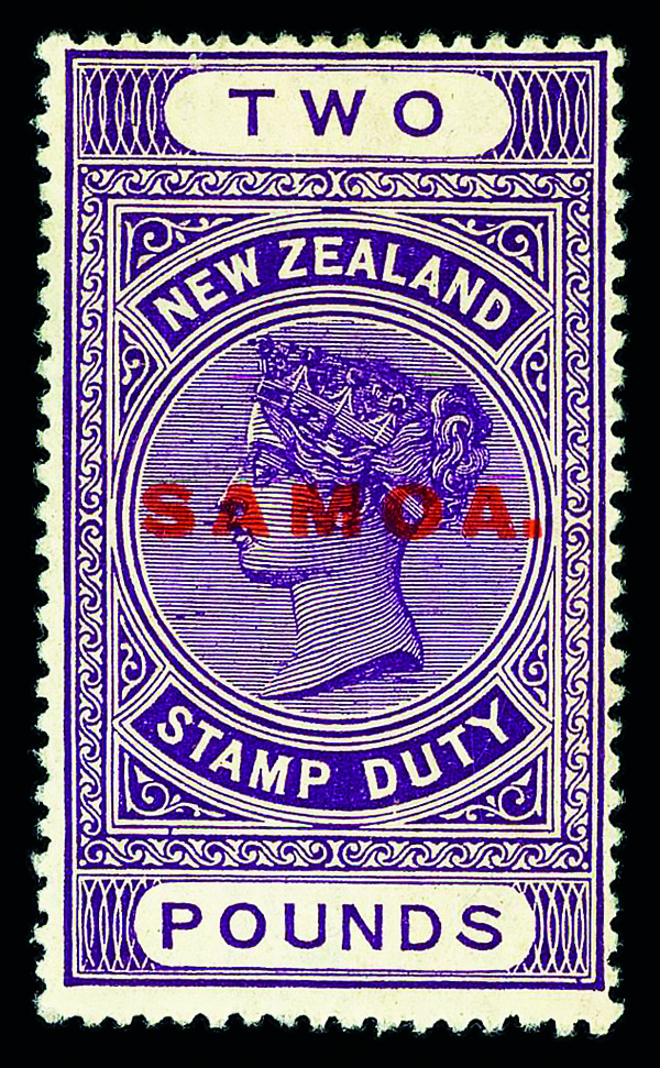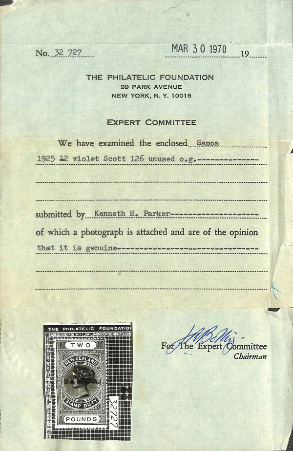 9590 og 126 image1925, "SAMOA." on New Zealand £2 Postal Fiscal (Scott 126), single, o.g., hinge remnant, Fine to Very Fine, with 1970 P.F. certificate.