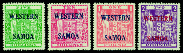 9593 nh 216-219 image1955, New Zealand Postal-Fiscal stamps overprinted in blue or carmine Western Samoa (Scott 216-219), complete set of singles, o.g., never hinged, Very Fine.