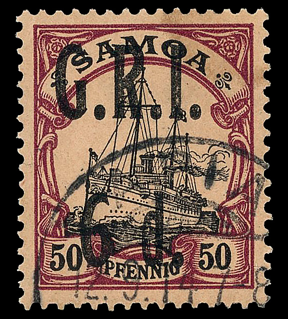 9587 og 108 image1914, G.R.I. 6d on German Samoa 50pf black & purple on buff (Scott 108), single, o.g., lightly hinged, Very Fine.