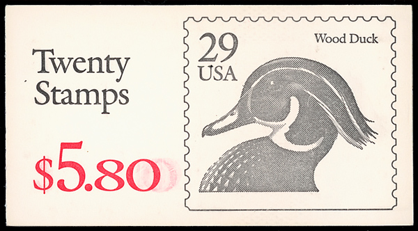 9146 BKnh BK174b image1991, 29¢ Wood Duck, black "29 USA", imperforate between, complete booklet (Scott BK174b), complete unexploded booklet, o.g., never hinged, fresh and sound, containing two #2484f panes of ten with horizontal perforations strongly misplaced to top (as per Scott), cover showing ghosting of red value, Very Fine.