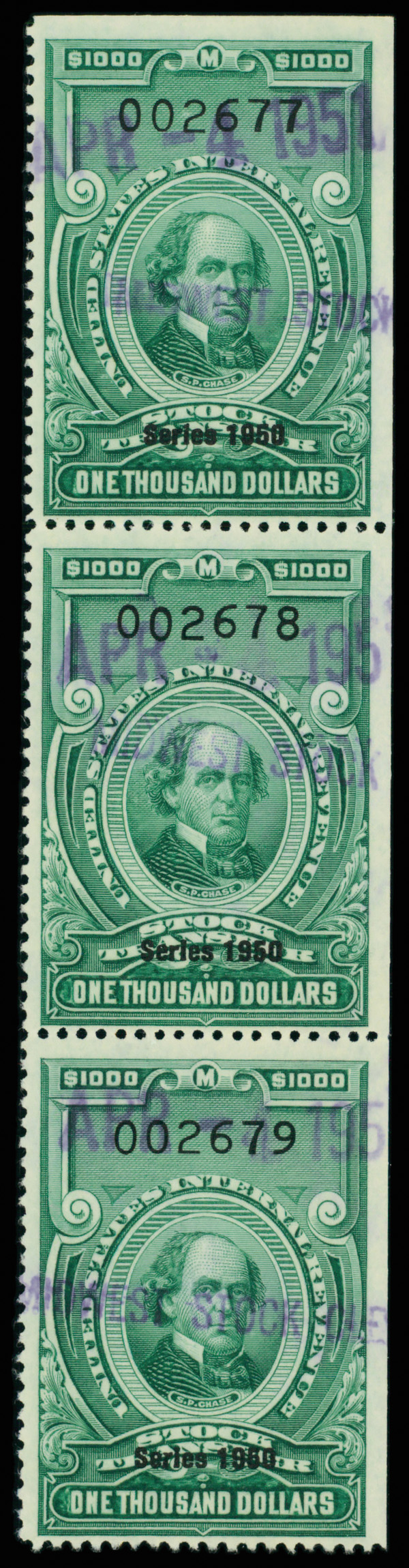 9136 O RD335 imageStock Transfer, 1950, $1,000 Chase (Scott RD335), vertical strip of 3, Fine.
