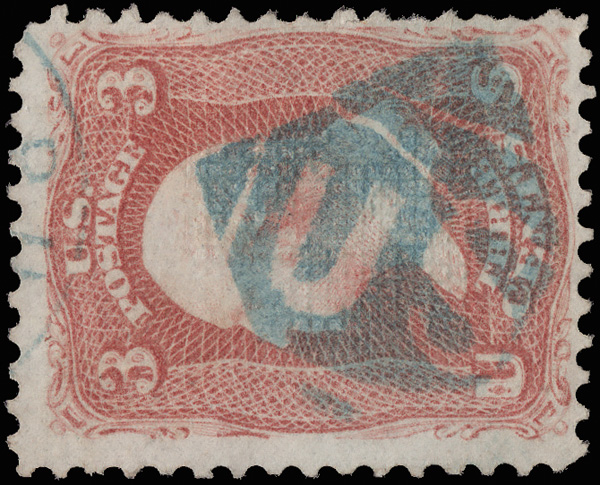 9150 O Unlisted imageNegative "US" (Skinner-Eno Unlisted), virtually complete strike in blue on a Fine 3¢ F. grill (94); "St. Joseph, Mo." penciled on reverse. (Image) Suggested Bid $45