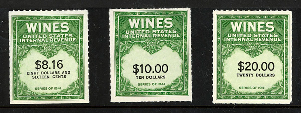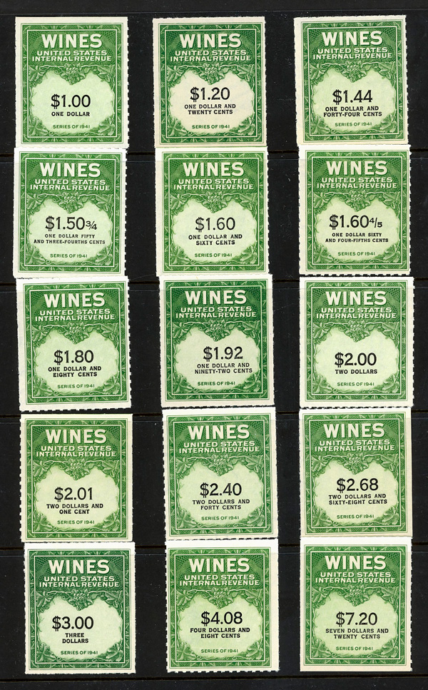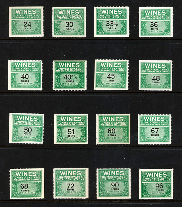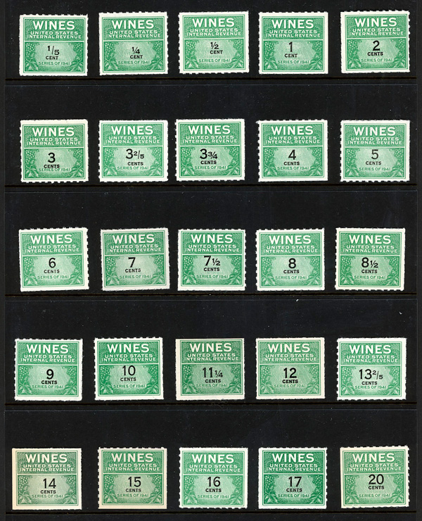 9137 ng RE108//RE203 imageWine Stamps, 1942-54, 1/5¢-$20.00 (Scott RE108//RE203), selection of 59 different, without gum as issued, Fine to Very Fine.