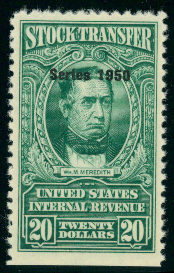 9135 ng RD329 imageStock Transfer, 1950, $20 Meredith (Scott RD329), unused without gum; straight edge at bottom, Very Fine.