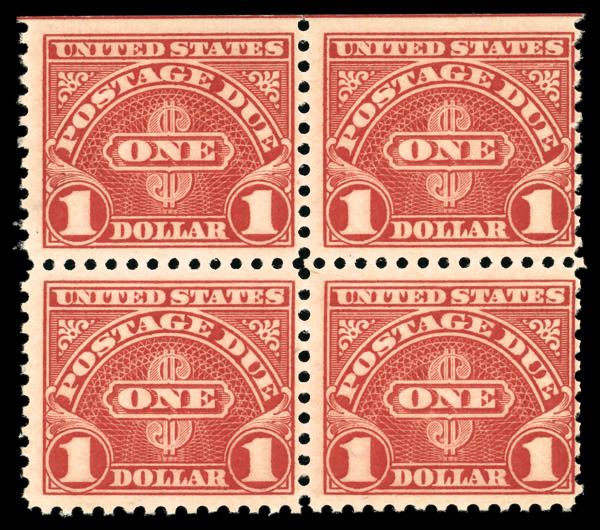 9121 nhbl J77a imagePostage Due, 1930, $1 scarlet (Scott J77a), top margin block of 4 with guide line, o.g., never hinged, Fine.