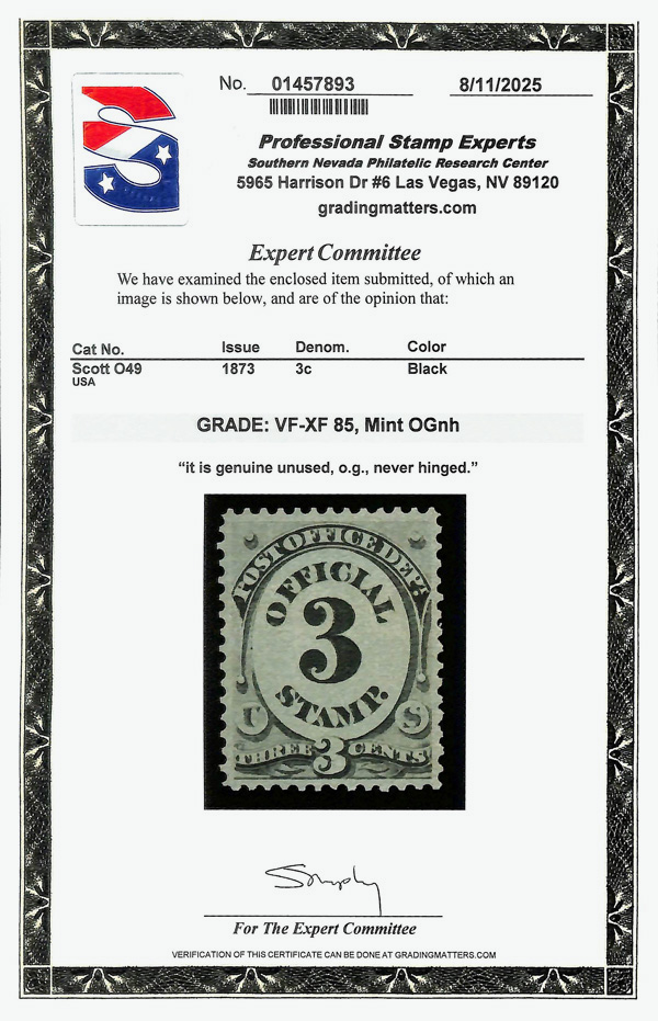 9123 nh O49 imagePost Office Dept., 1873, 3¢ black (Scott O49), Bright and sharply inked, o.g., never hinged, Very Fine to Extremely Fine, with 2025 P.S.E. certificate graded VF-XF 85.