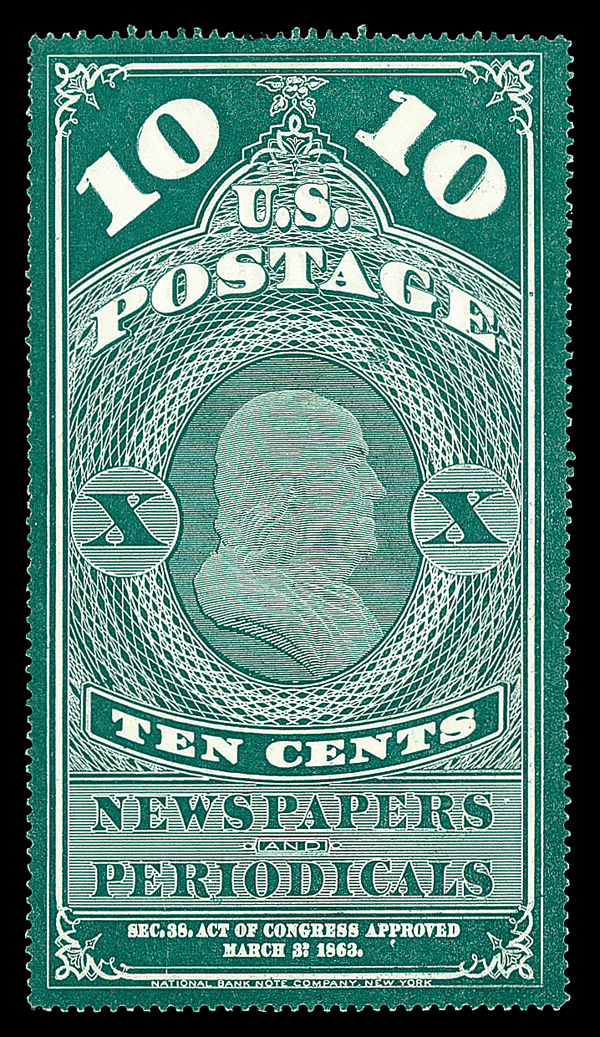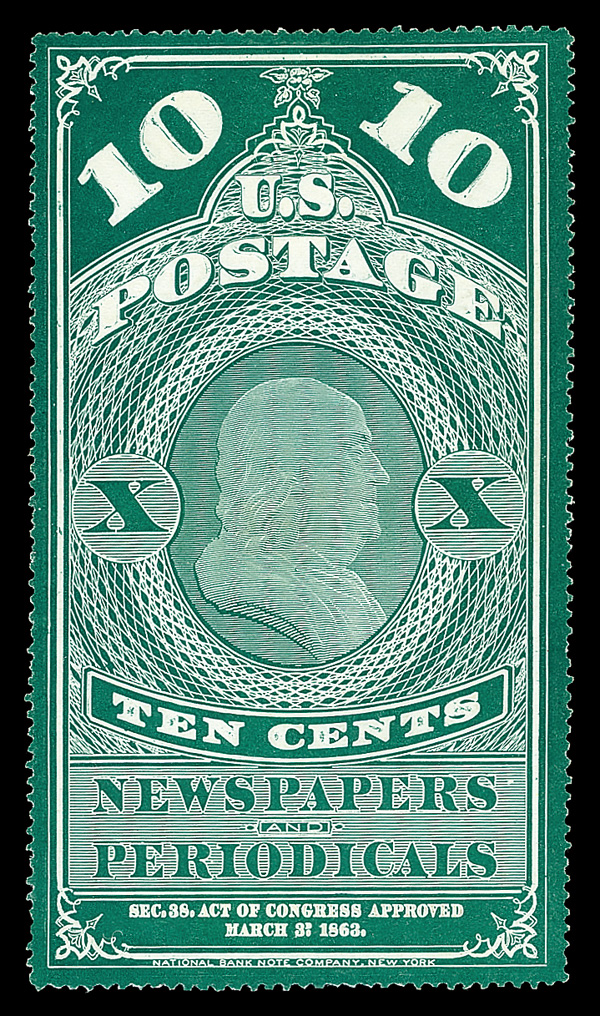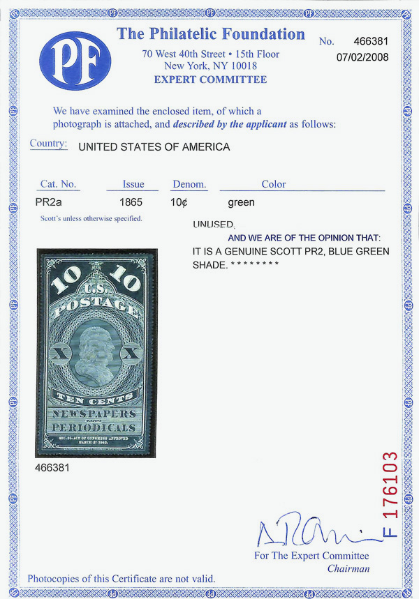 9124 ng PR2 imageNewspaper, 1865, 10¢ blue green (Scott PR2), Lovely depth and clarity, without gum as issued, Very Fine to Extremely Fine, with 2008 P.F. certificate.
