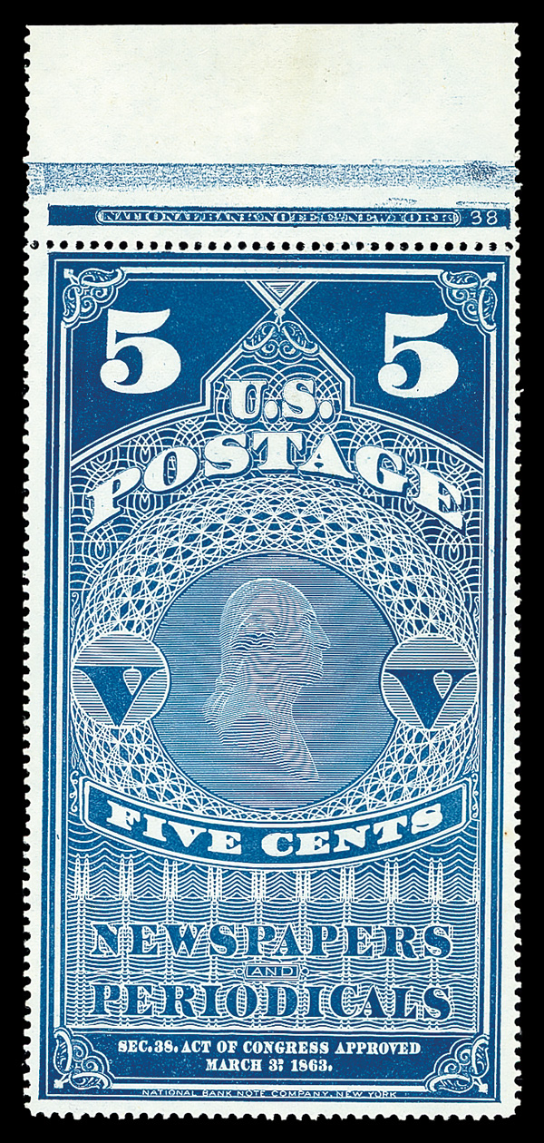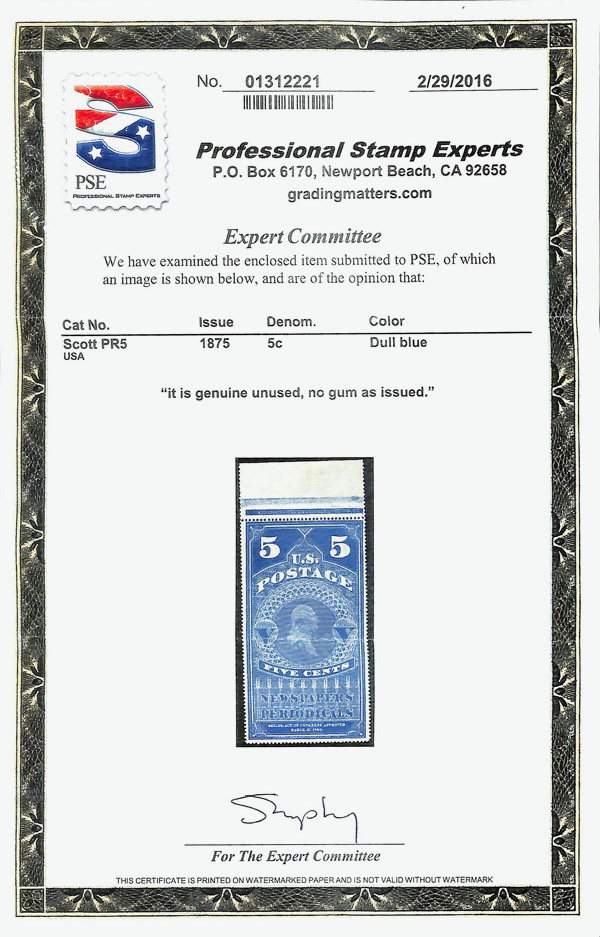 9125 ng PR5 imageNewspaper, 1875, 5¢ dull blue, C.B.N.C. "Hard Paper" Reprint of the 1865 issue (Scott PR5), Beautiful, vibrant printed quality, without gum as issued, Fine, with 2016 P.S.E. certificate.