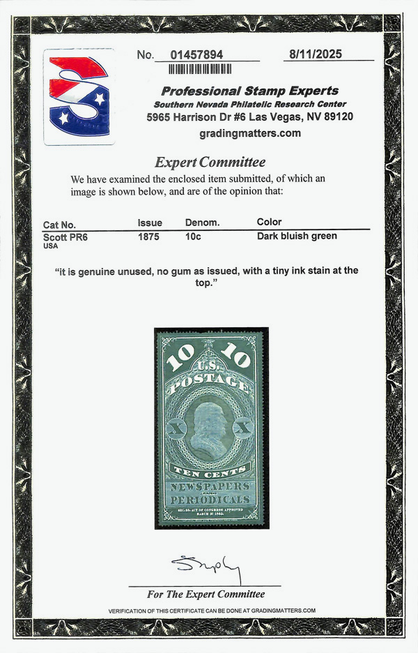 9126 ng PR6 imageNewspaper, 1875, 10¢ dark bluish green, C.B.N.C. "Hard Paper" Reprint of the 1865 issue (Scott PR6), Crisp, glowing appearance, without gum as issued; tiny ink stain at top, Very Fine, with 2025 P.S.E. certificate.