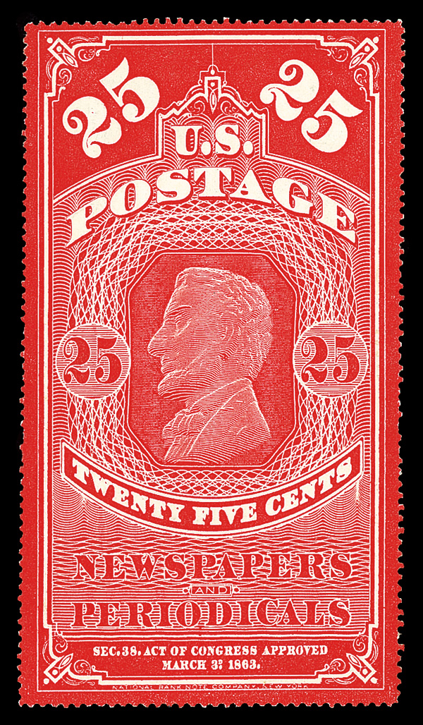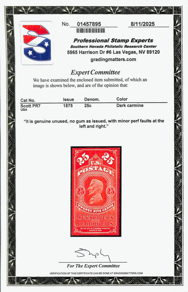 9127 ng PR7 imageNewspaper, 1875, 25¢ dark carmine, C.B.N.C. "Hard Paper" Reprint of the 1865 issue (Scott PR7), Clear, deeply printed design, without gum as issued; minor perf faults at left and right, Very Fine, with 2025 P.S.E. certificate.