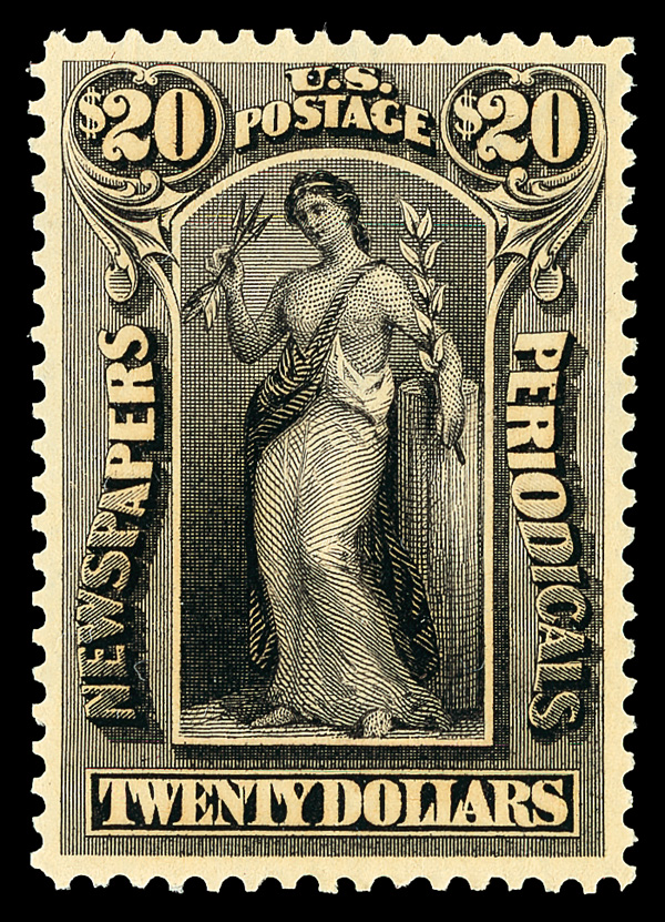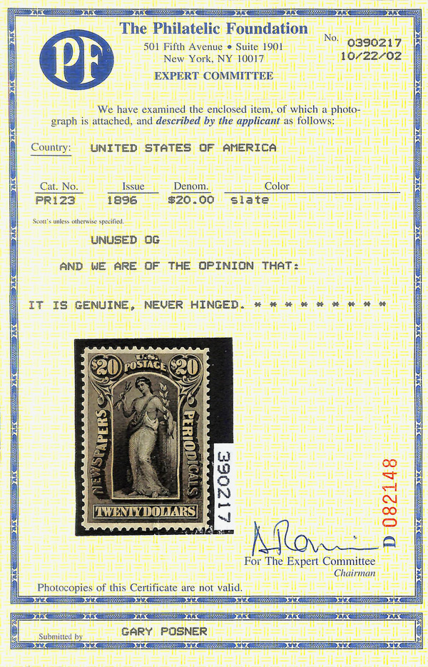 9128 nh PR123 imageNewspaper, 1896, $20 slate, Bureau printing, D.L. watermark (Scott PR123), Handsome rich color presence, o.g., never hinged, Very Fine to Extremely Fine, with 2002 P.F. certificate.