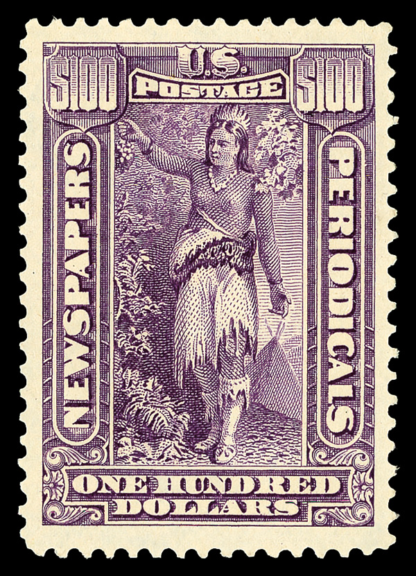 9129 nh PR125 imageNewspaper, 1896, $100 purple, Bureau printing, D.L. watermark (Scott PR125), Radiant, eye-catching appeal, o.g., never hinged, Very Fine to Extremely Fine, with 2001 P.F. certificate.