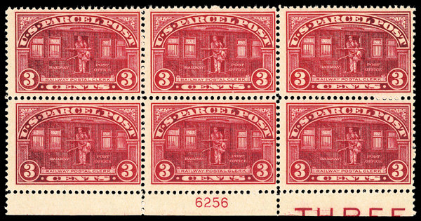 9130 nhbl q3.6256imprint6 imageParcel Post, 1913, 3¢ Railway Postal Clerk (Scott Q3), bottom margin plate number 6256 block of 6 with imprint, o.g., never hinged, fresh and sound with immense color depth, Fine to Very Fine.