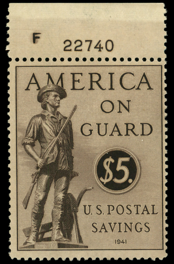 9145 nh PS15 imagePostal Savings, 1941, $5 sepia (Scott PS15), plate number single, o.g., never hinged (noticeable gum skip), Fine to Very Fine.