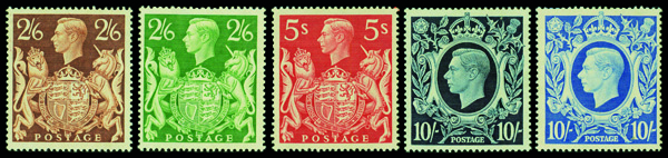 9160 og 249-251A image1939-42, King George VI "Square" high values, 2s6d to 10s (Scott 249-251A), complete set of singles, o.g., lightly hinged or hinge remnant, Very Fine.