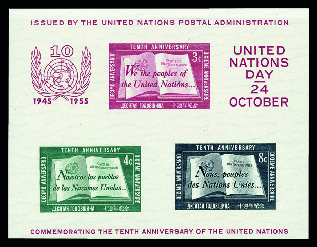 9148 nhbl 38 image1955, 10th Anniversary souvenir sheet (Scott 38), souvenir sheet of 3, o.g., never hinged, Superb.