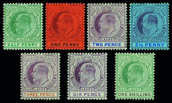 9268 og 40-46 image1904, King Edward VII, ½d-1s (Scott 40-46), Crown CA watermark, singles, o.g., hinge remnant, Fine to Very Fine.
