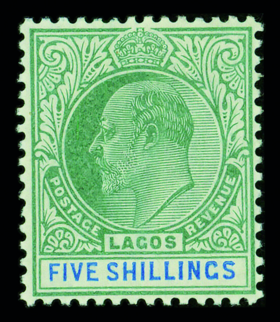 9270 og 48 image1904, King Edward VII, 5s green & blue (Scott 48), Crown CA watermark, single, o.g., invisibly hinged, Fine to Very Fine.
