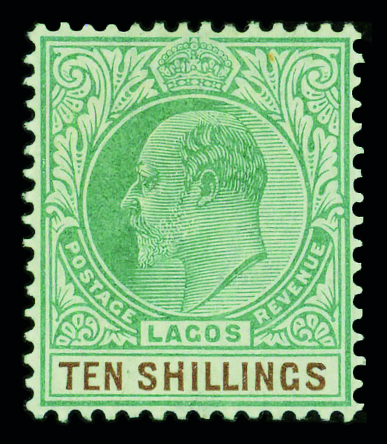 9271 og 49 image1904, King Edward VII, 10s green & brown (Scott 49), Crown CA watermark, single, o.g., lightly hinged, Fine to Very Fine.