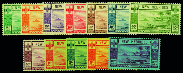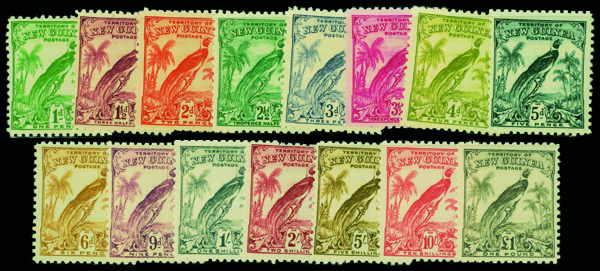 9324 og 31-45 image1932-34, Bird of Paradise (without dates), 1d to £1 complete (Scott 31-45), complete set of singles, o.g., lightly hinged, Fine to Very Fine.