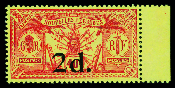 9328 nh 31 image1921, Native Idols 2p on 40c red on yellow paper surcharged (Scott 31), right margin single, o.g., never hinged, Superb.