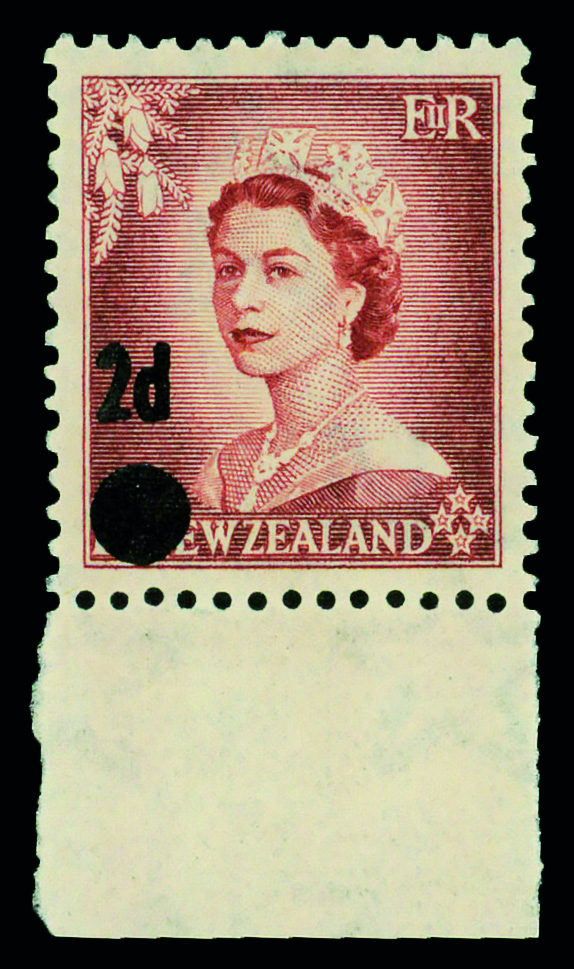 9338 nh 320 image1958, Queen Elizabeth II 1½p rose brown surcharged 2p (Scott 320), bottom margin single, o.g., never hinged, Fine to Very Fine.