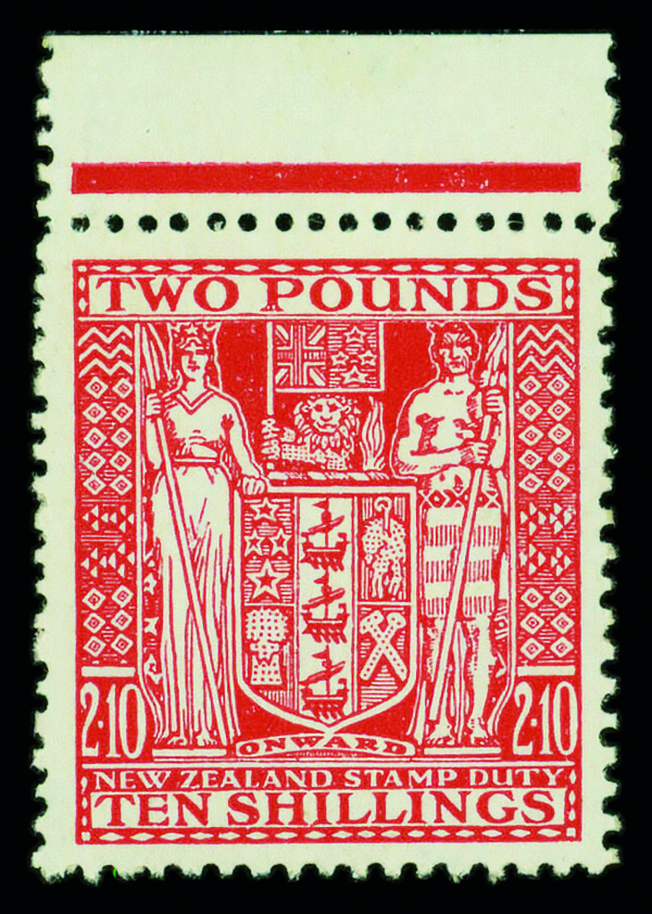 9339 nh AR90 imagePostal-Fiscal, 1951, £2 10s red (Scott AR90), Multiple NZ & Star watermark, top margin single, o.g., never hinged, Fine to Very Fine.