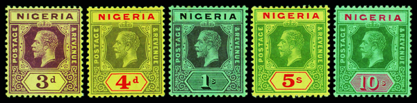 9344 og 13-17 image1914-27, King George V 3p-10sh surface colored paper (Scott 13-17), complete set of singles, o.g., hinge remnants, Fine to Very Fine.