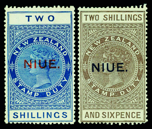 9350 nh 30-31 image1918-23, New Zealand Postal-Fiscal stamps over printed NIUE (Scott 30-31), single2, o.g., never hinged, Fine.
