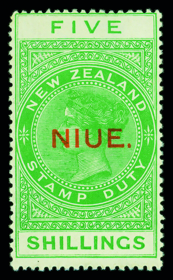 9351 og 32b image1929, 5sh green New Zealand Postal-Fiscal stamp overprinted Niue (Scott 32b), single, o.g., invisibly hinged, Fine.