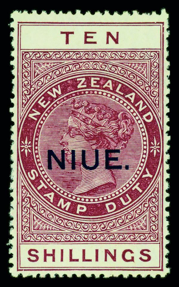 9352 og 33a image1929, 10sh red brown New Zealand Postal-Fiscal stamp overprinted Niue (Scott 33a), single, o.g., invisibly hinged, Fine.