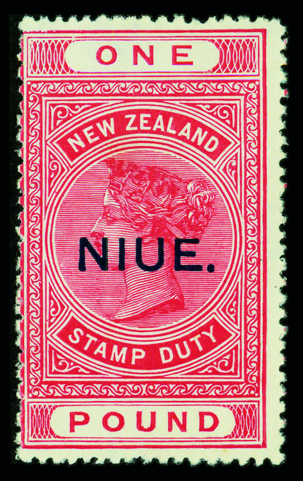 9353 og 34 image1929, £1 rose New Zealand Postal-Fiscal stamp overprinted Niue (Scott 34), single, o.g., invisibly hinged; 3 small stain spots on back of stamp, Fine.