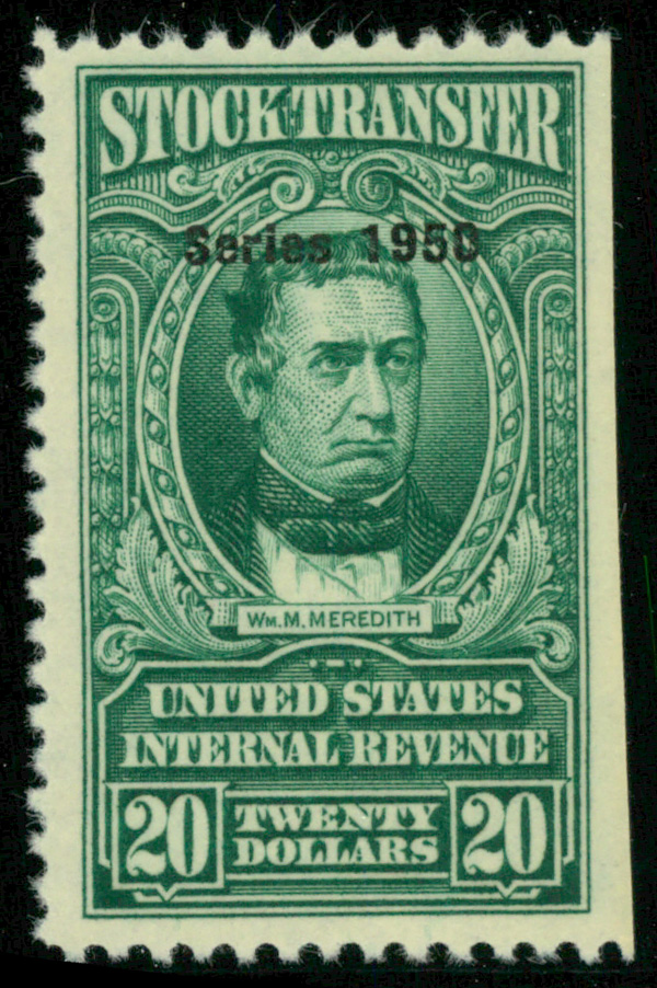 5418 ng RD329 imageStock Transfer, 1950, $20 Meredith (Scott RD329), unused without gum; straight edge at right, Very Fine.