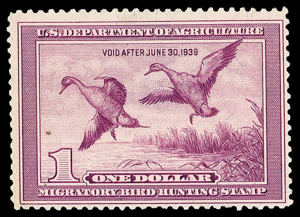 5429 nh RW9 imageFederal Duck Stamp, 1942, $1 Baldpates (Scott RW9), plate number single, o.g., never hinged, Fine to Very Fine.