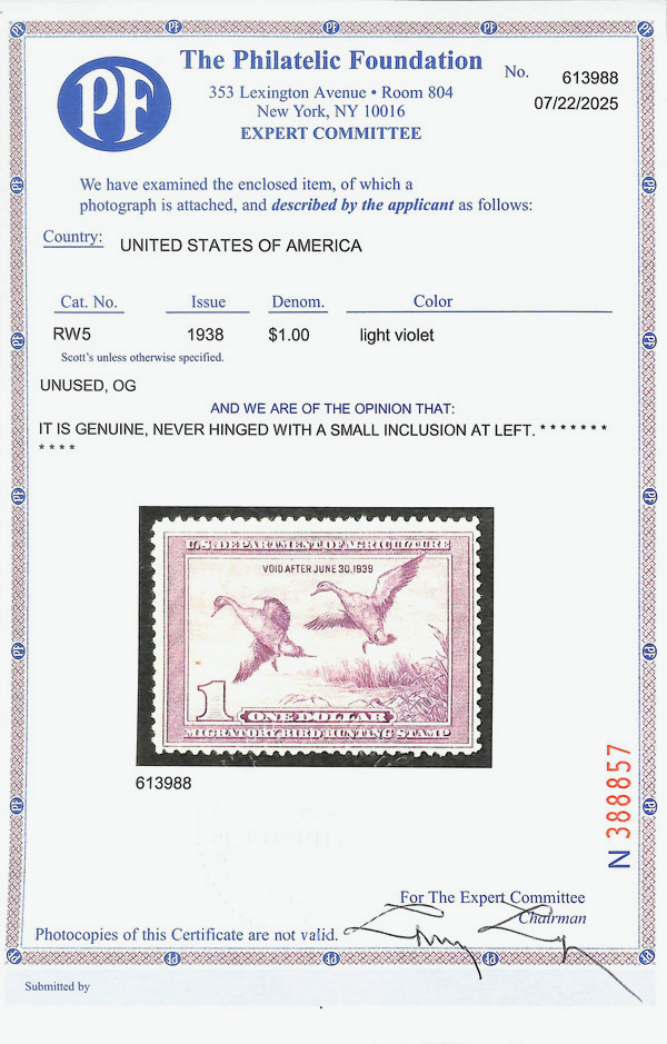 5428 nh RW5 imageFederal Duck Stamp, 1938, $1 Pintail Drakes (Scott RW5), o.g., never hinged (paper inclusion), Fine.
