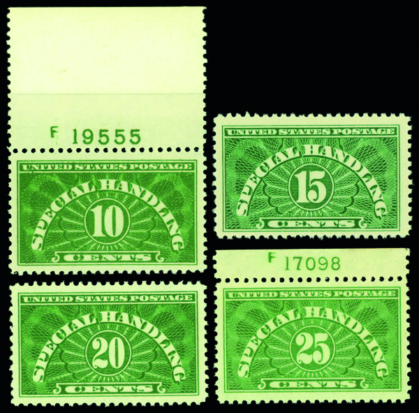 5403 nh QE1-QE4 imageSpecial Handling, 1925-28, 10¢ to 25¢ complete (Scott QE1-QE4), 10¢ & 25¢ plate number singles, o.g., never hinged, Very Fine.