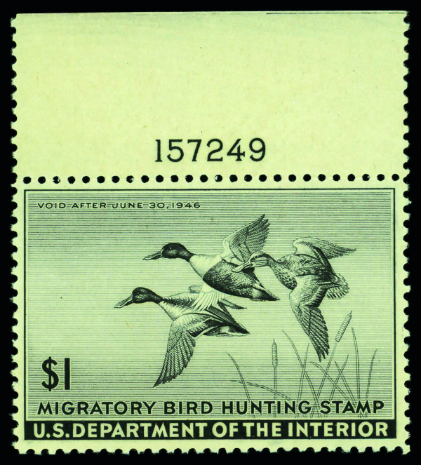 5431 nh RW12 imageFederal Duck Stamp, 1945, $1 Shoveller Ducks (Scott RW12), plate number single, o.g., never hinged, Fine to Very Fine.