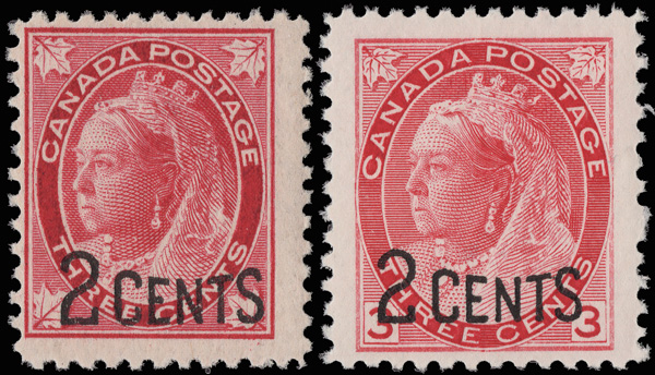 5693 nh 87-88 image1899, Queen Victoria, 2¢ on 3¢ Surcharges (Scott 87-88), o.g., never hinged, post office fresh, the first Fine, the second a Fine to Very Fine Jumbo.