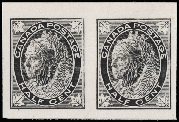5685 P 66P image1897, Queen Victoria "Maple Leaf", ½¢ black, plate proof, India on card (Scott 66P), horizontal pair with partial top sheet margin, incredibly fresh, Extremely Fine.