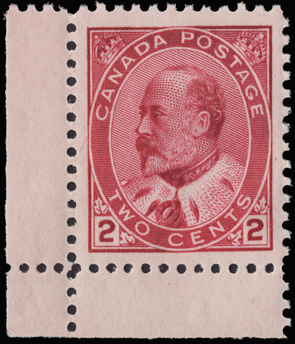 5695 nh 90 image1903, King Edward VII, 2¢ carmine, type II (Scott 90), an eye-popping lower right corner margin single, o.g., never hinged, perfectly centered with large margins and extraordinary color; gum slightly discolored from former heavy color oxidation, otherwise Extremely Fine to Superb.