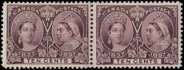 5683 nh 57 var. image1897, Queen Victoria Jubilee, 10¢ brown violet (Scott 57 var.), a fresh, well centered horizontal pair with a light horizontal guide line in the bottom margin, o.g., never hinged, Very Fine.