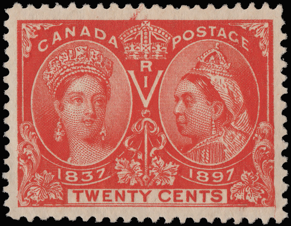 5684 og 59 var. image1897, Queen Victoria Jubilee, 20¢ vermilion, printing flaw/plate flaw (Scott 59 var.), an incredible, perfectly centered, bright colored single with a small printing ink smear at the top center and a plate scratch of engraver's slip at the lower right, o.g., very lightly hinged, fresh and absolutely Superb.