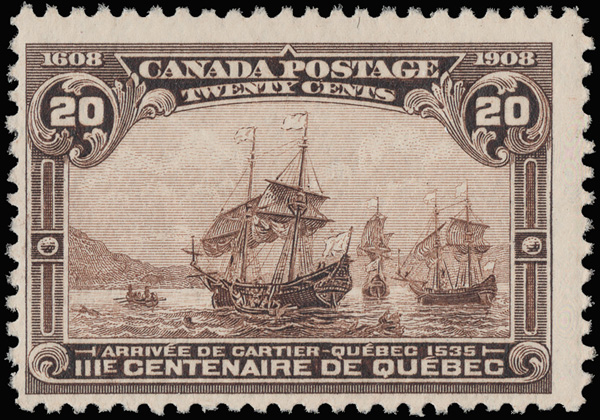 5704 nh 100 image1908, 7¢ Quebec Tercentenary (Scott 100), an exceptional mint single, o.g., never hinged, fresh and virtually perfectly centered, Very Fine to Extremely Fine.