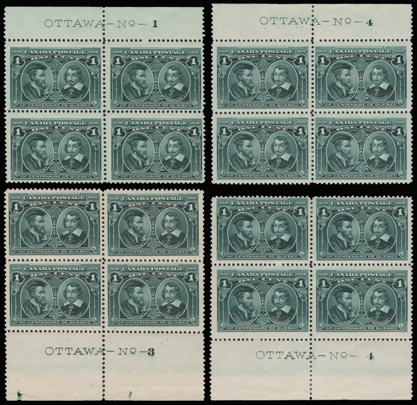 5701 ogbl 97 image1908, 1¢ Quebec Tercentenary (Scott 97), group of five different plate blocks of 4, o.g., lightly hinged, top plate nos. 1, 2 & 4, and bottom nos. 3 & 4, Fine to Very Fine.