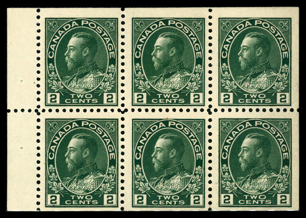 5709 BKog 107c image1922, King George V "Admiral", 2¢ yellow green, booklet pane of 6, wet printing (Scott 107c), rich color, o.g., barest trace of hinging affecting two stamps, fresh and fine to very fine.