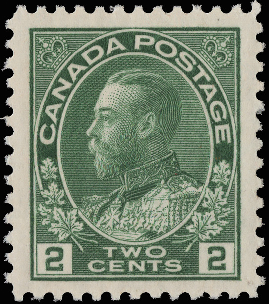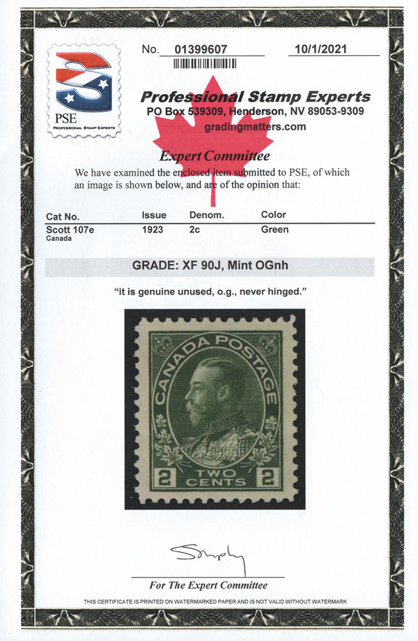 5710 nh 107e image1923, King George V "Admiral", 2¢ green, dry printing (Scott 107e), o.g., never hinged, fresh and very well centered with extra large margins, Extremely Fine, with a 2021 P.S.E. certificate graded XF 90 J.