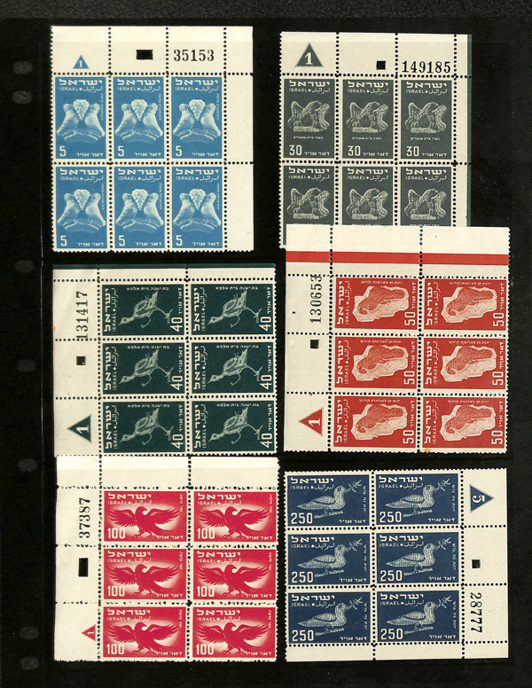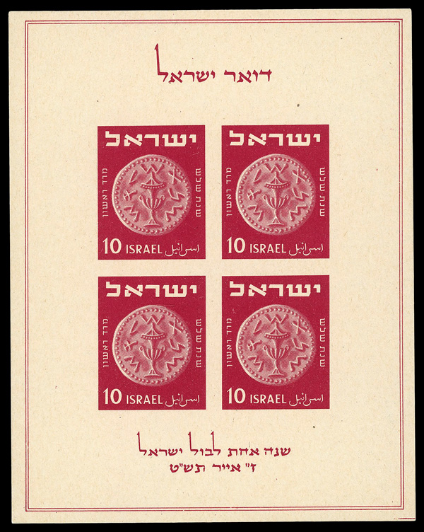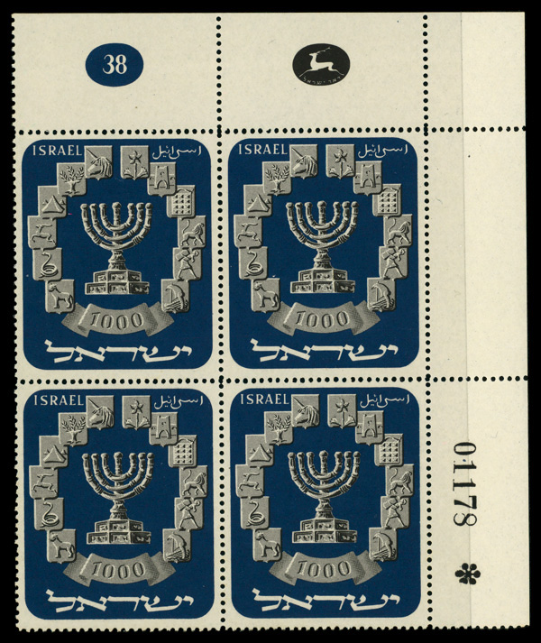 5899 nhbl 55 image1952, 1000p Menorah (Scott 55), plate block of 4, o.g., never hinged, Very Fine.