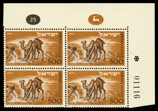 5898 nhbl 25 image1950, 500p Negev Camel (Scott 25), plate block of 4, o.g., never hinged, Fine to Very Fine.