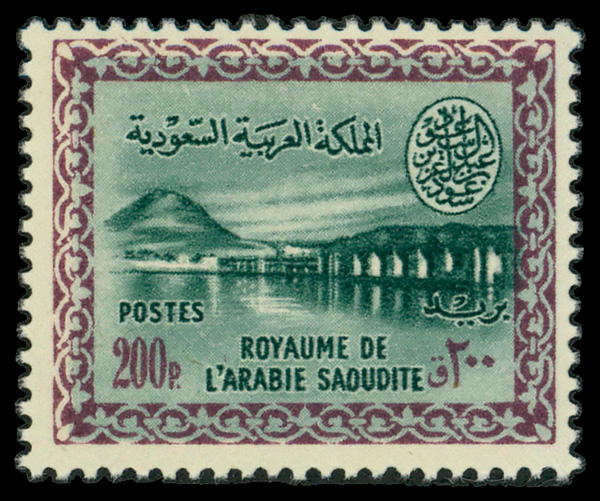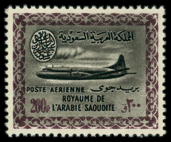 6058 nh C21 imageAirmail, 1961, 200pi Vickers Jet, King Saud Cartouche (Scott C21), single, o.g., never hinged, Fine to Very Fine.