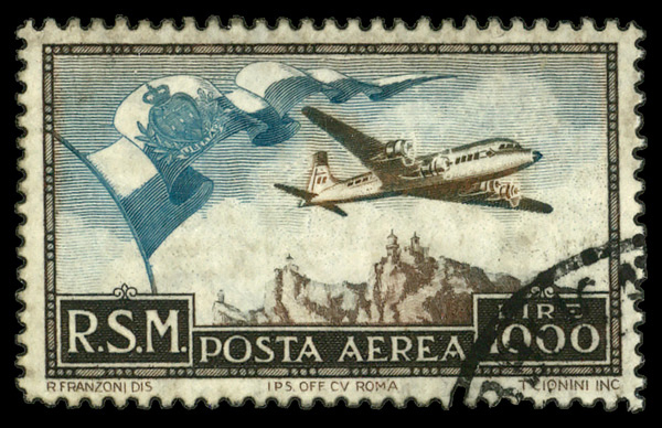 6044 O C77 image1951, Flag and Plane 1000l Dark brown & blue (Scott C77), single, Fine to Very Fine.